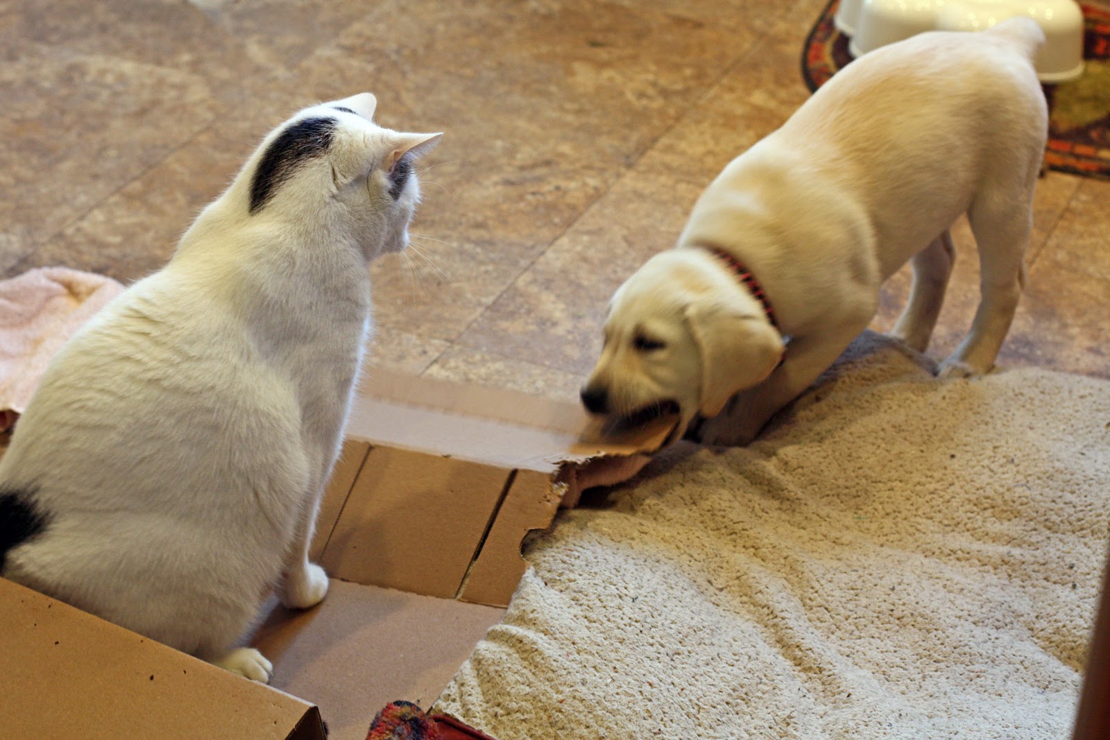 Ah, but what about the cat and his visions of grandiosity, you ask? Honestly, I really didn’t know which one to be afraid for. Who will be predator and who the prey? I knew to keep a close watch on this new relationship.