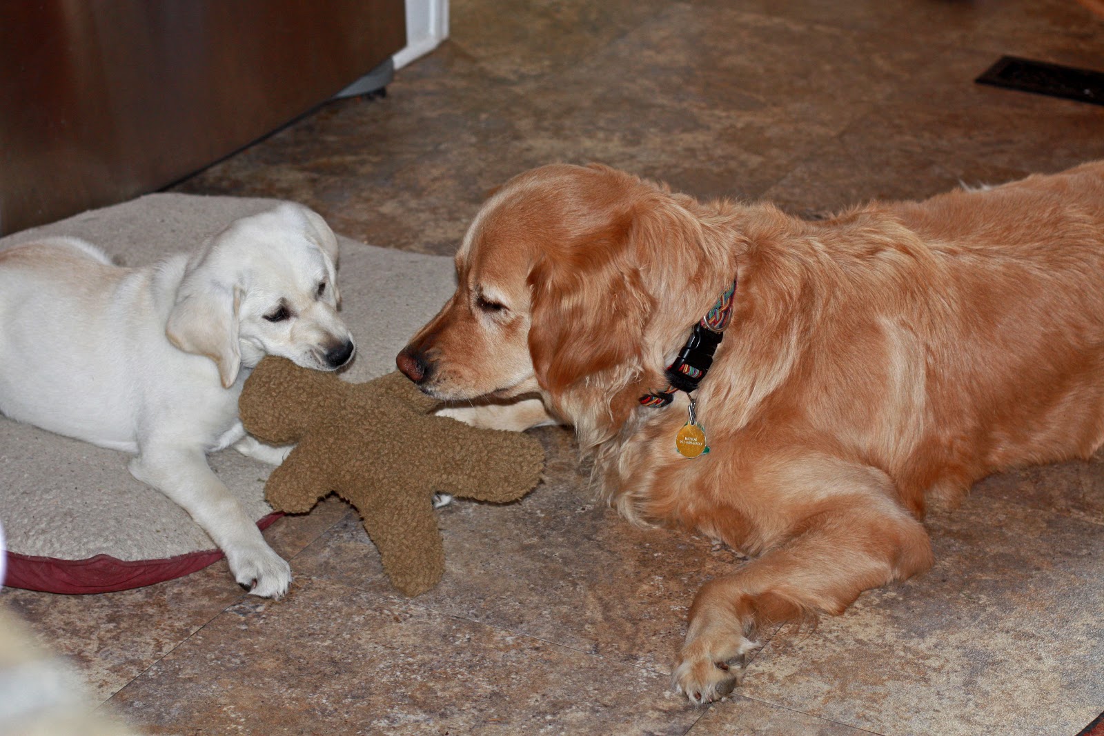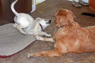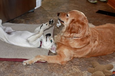 . . . hahaha [snort]. Ok, big guy, I continue. Here’s a couple of you two sharing another toy. Well ok, not a toy really. It seems you two have developed an allergy to the plethora of doggie toys I trip over in the kitchen. You’re playing Keep Away with a scrap of newspaper. It was kind of a short lived game.