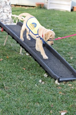 On the left, Euka and Emma are walking on a wobble board. As working dogs, they’ll be asked to walk across different surfaces. A service dog can’t try to avoid or move around an unfamiliar surface, so confidence here is a requirement.