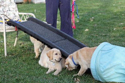 Moving along, we reach the ramp station. Can the pups accept this surface, one that will have them exposed above the ground?