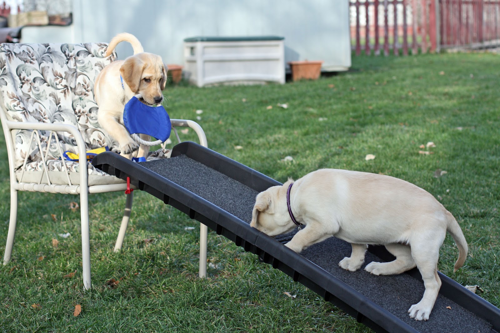 The photo at the top of the post has Everett and Ella in a tube during playtime. As a training exercise we put the pups in a Sit/Stay at one end, then called them through to the other. An enclosed environment is another situation that we want them to be comfortable with. Think about air travel; there’s not much room at the feet of an individual traveling with their service dog by airplane. That’s indeed some tight quarters in the cabin, for both man and beast, so we want the pups to know that it’s still safe when in a space that surrounds their body.