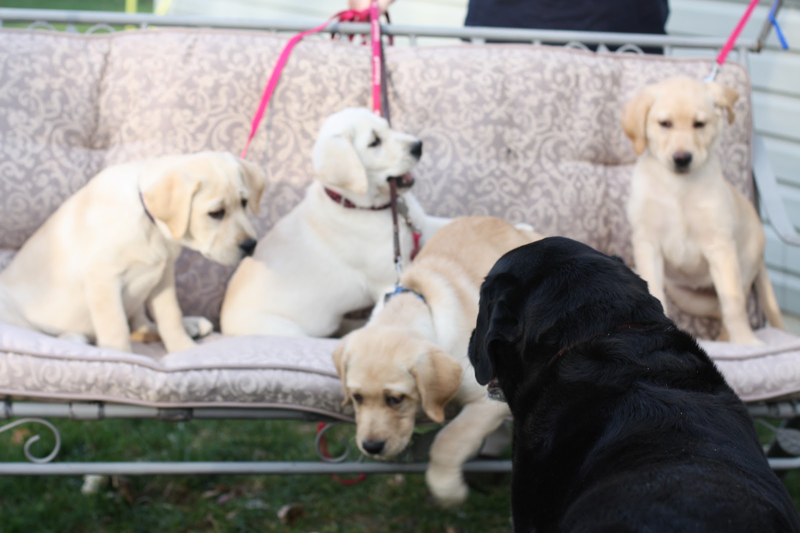 Wanna take a guess? How many puppy raisers does it take to get four eleven-week-old puppies to sit nicely on a lawn swing. Ha ha, y’all. No, it’s not twenty, but thanks for thanking that. Actually, I’m not gonna tell you because it’s too embarrassing.