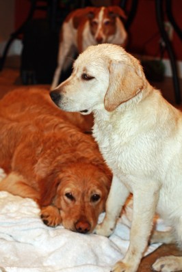 And absolutely not the scene I had before me a mere five seconds ago. The dogs are fresh from their bath, damp and clean. Bodine came up from the basement for his evening rounds and had curled up next to the two of them on the dog bed. He was grooming them. Alternating dogs to lick their fur dry. And purring. Seriously.