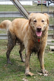 The final answer, and the only option at hand, is the very one I’d been avoiding. I’ll have to put him in the bathtub. Upstairs. Moving through the kitchen, I hold the big dog by the collar while spouting open threats of a very cold bath if he dares to shake his muddy self on my stainless steel appliances. We negotiate the stairs, slime down the hall together and finally make it to the bathtub. The good news is that the bath should go a lot easier now that we left a muddy wake along our path to get here.