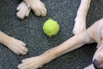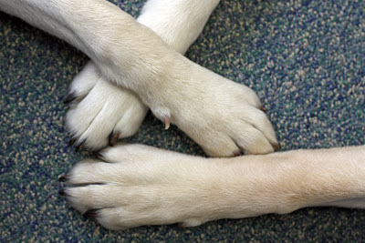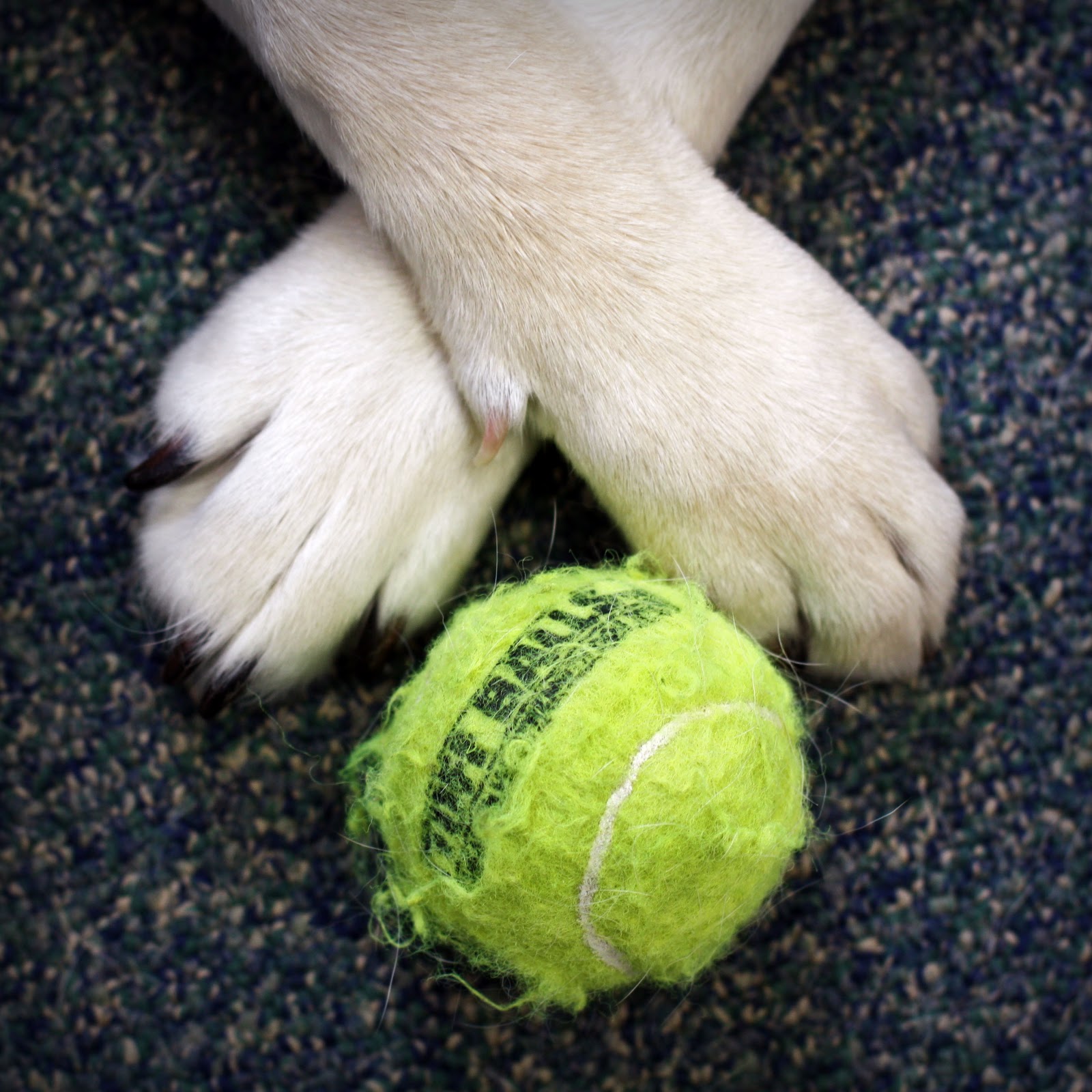 And the yellow tennis ball, as round and bright as the sun itself, well, it represents that service dogs can have fun, too. The ball is within reach, actually touching a furry paw. Showing that these working girls can transistion from serious business to playtime and then back again. Just a touch away.