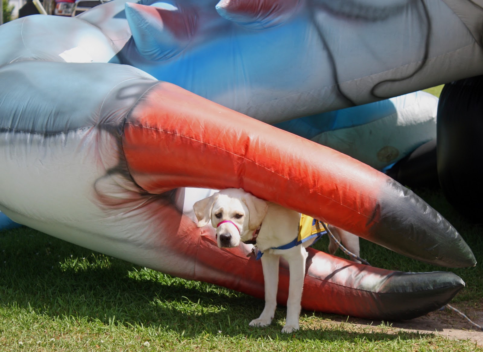This air infused bug is not only making an odd hissing sound brought on by the generator inflating the thing, but it’s swaying in the wind as well. Has Euka seen such a creature in her eight months of life? Of course not. I’ve been around a lot longer than her and I’ve never encountered a ten foot balloon crab either.