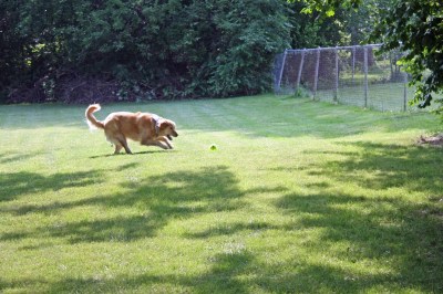 With a wide doggy smile and plumed tail waving like a flag, he drops the slightly damp ball upon a lap and takes a step back. His thoughts are radio waves with one simple repeating message: throw the ball throw the ball throw the ball . . . .