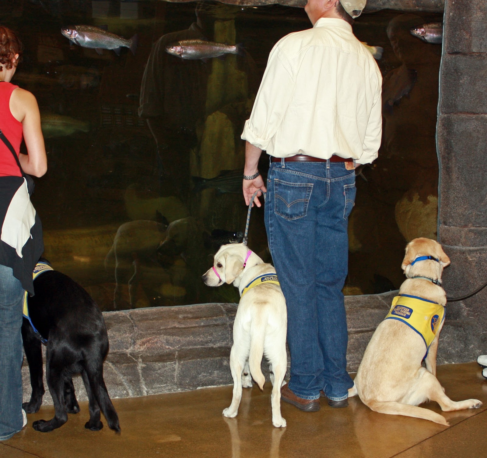But no matter, we make it on time for an obligatory after-the-drive potty break for Euka and to join the other CCI puppy raisers outside Cabela’s entrance. Walking towards the gathering group I realize, if memory serves, this is only the third time Euka has been in the presence of so many other CCI puppies in training. We give her a moment to process this info across the canine neurons (play or work?) before we move into the training event in the store.
