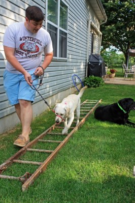 Our training facilitators, Emma’s puppy raisers, have provided some props to bump up the session for additional challenges. A ladder flat to the ground provides a walking experience over a novel surface.
