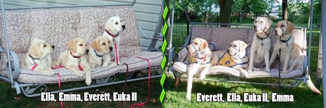 In this photo on the left our E’s are in a Sit with an implied Stay. For CCI commands, a Sit or Down comes with the Stay command unspoken yet still attached. That is, the pups learn that they are being asked to maintain their spot until the next command is given. A very helpful mindset to have wired into their mindsets are they learn to be service dogs. And so as the pups mature, we extend the Sit/Downs with the implied Stays for longer periods.