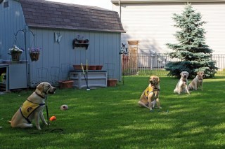We had the Ohio E’s together for a training session a couple of weeks ago. When Ella, Emma, Everett and Euka were a young two months old, we introduced their puppy noggins to some new experiences during a group training. You can see what we covered back then in the post Time to Ramp It Up.