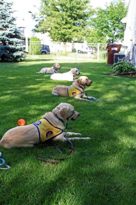 Puppy raisers are just out of the shot to provide a quick correction for any distracted furry thoughts. Should one of these E’s decide to move on from their Sit, they’re met with a verbal correction and get their bum placed right back to spot they were warming up just a moment before. See the orange thing by Ella? Yeah, we were tossing a football dog toy into their space for the extra challenge.