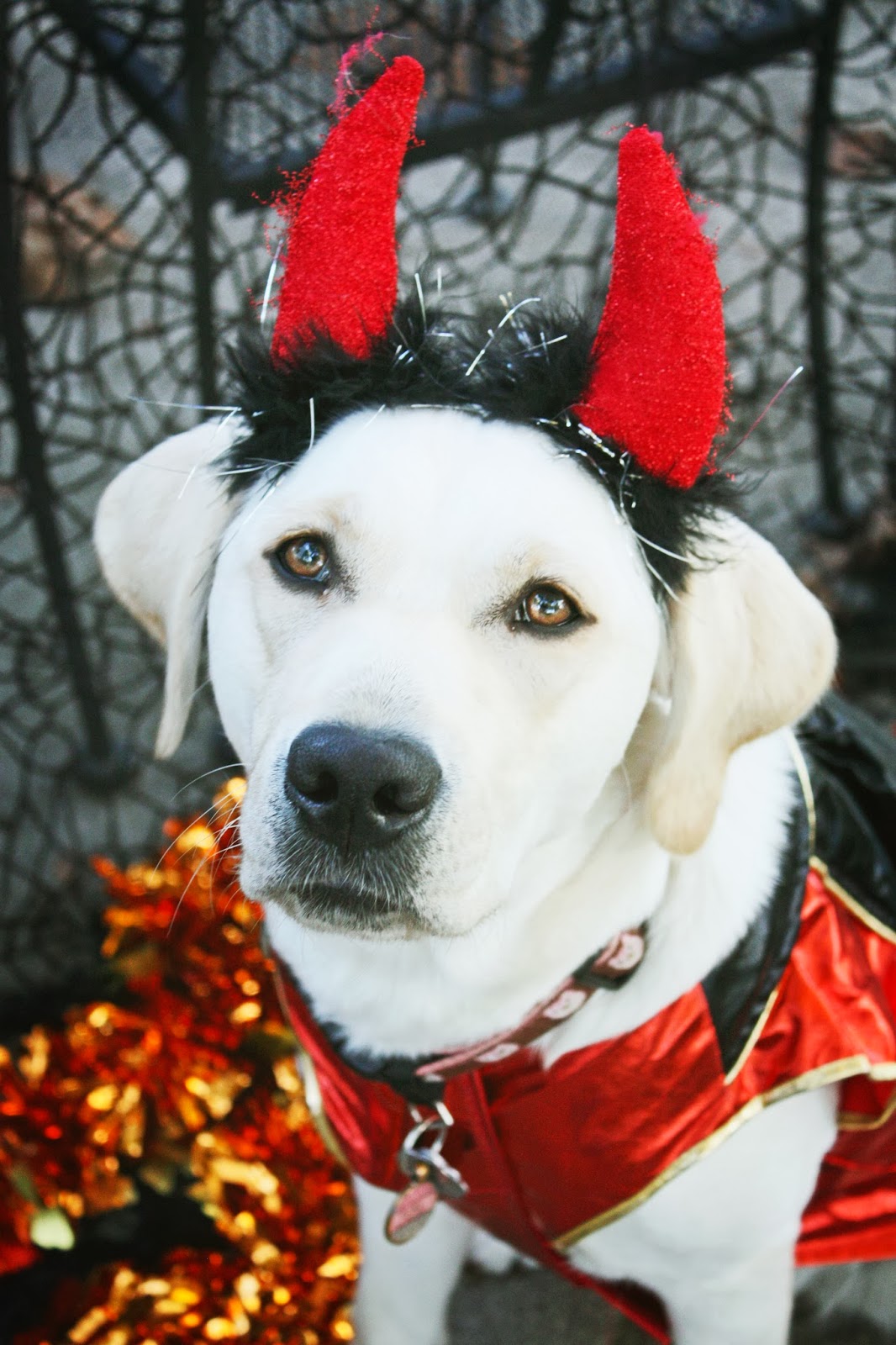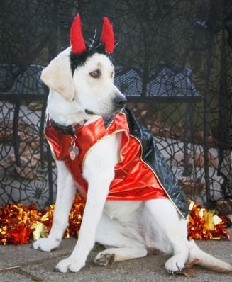 Alrighty then. On with the cape and devil horns. I’m not surprised to find these all slip on the pup like a second skin.