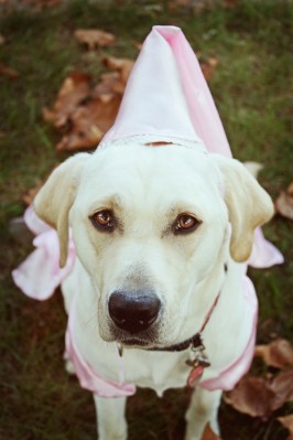Hmm, how ’bout the pretty, pretty princess dress? This was Inga’s first Halloween costume and the lovely pup just rocked it. Ok sure, let’s give this a try. I secured the gown’s velco and cinched up the tie to the girly-girl pink and pointed hennin*. And …