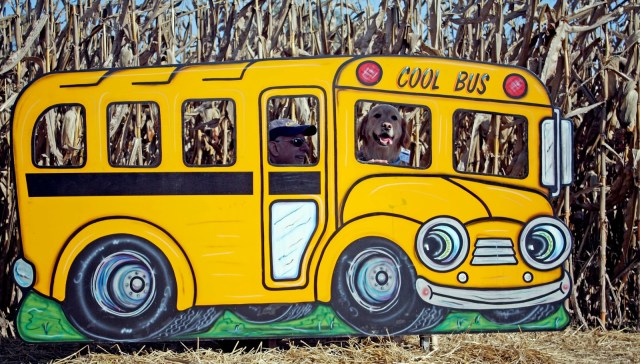 We can pretend that our Cool Bus is transporting kids to some British-ish institution of education, say like Hogwarts.  Because where else but a school of magic would a golden retriever be at the wheel on the right side of a school bus. With his five-fingered hand braced upon the dashboard for support as the bus balances on two wheels along those sharp turns.