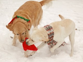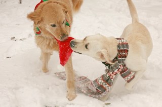Love the pictures! And the snow just makes it. I esp. like the one with curly elf cap and the very last one of the dogs playing tug with their Christmas gear. excellent!