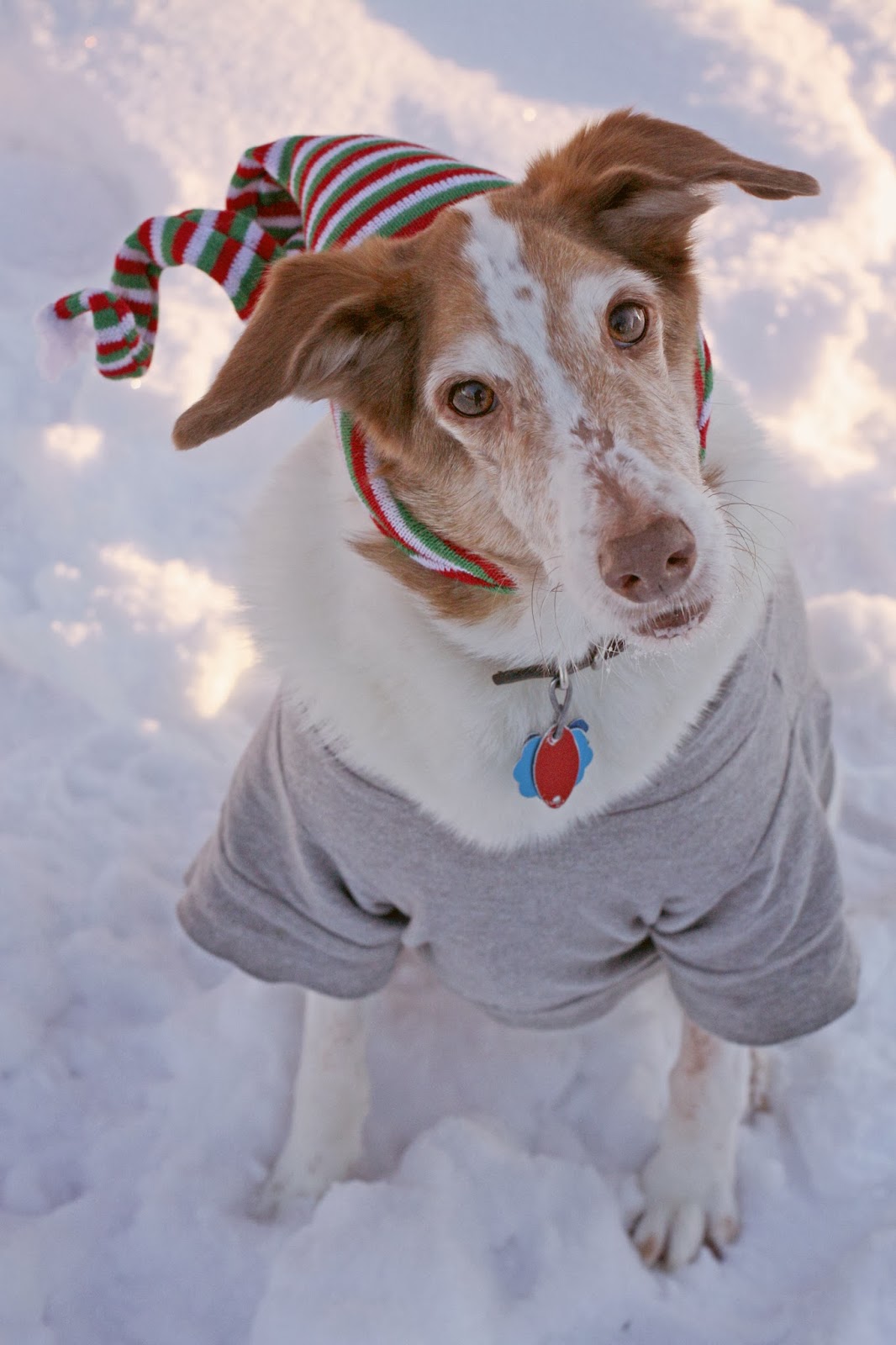 Love the pictures! And the snow just makes it. I esp. like the one with curly elf cap and the very last one of the dogs playing tug with their Christmas gear. excellent!