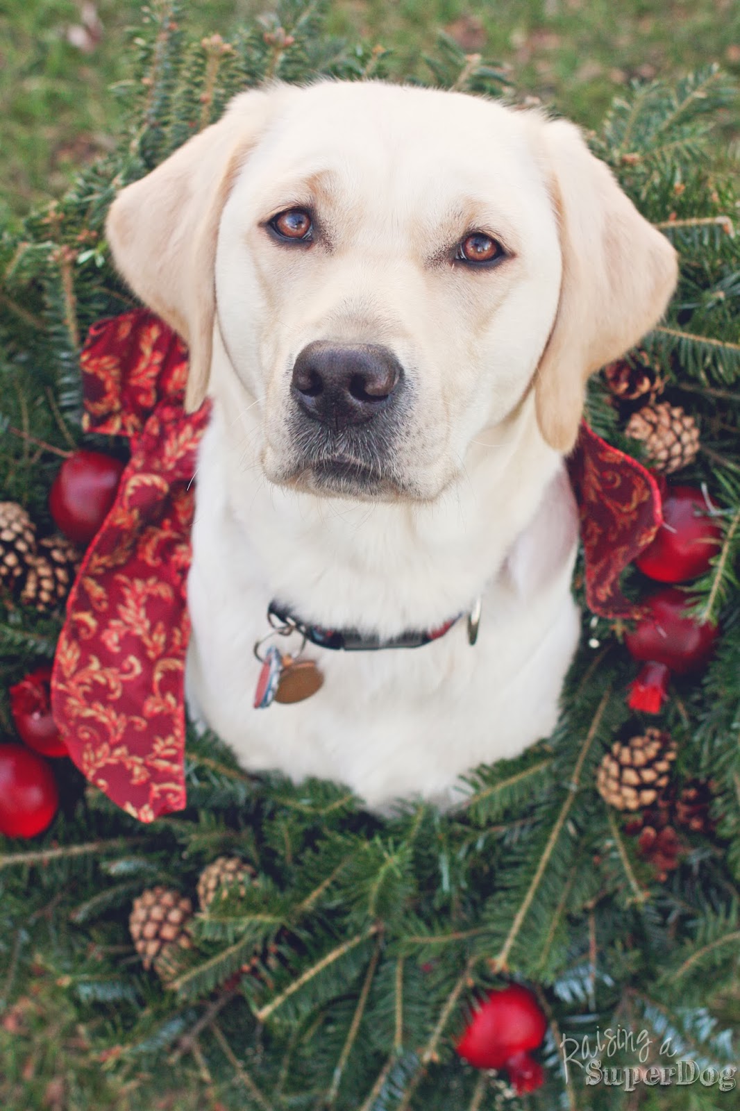 I admit with some self admonishment that I never thought about tossing a wreath about a dog’s wither regions as a photo prop. But once I saw Tippi’s holiday photo (a pup in training for Canine Companions for Independence), I was struck with inspiration.