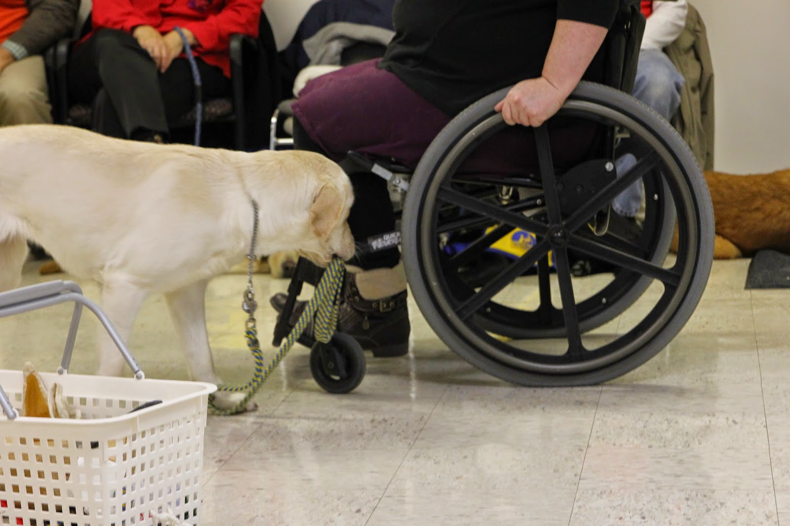 Turning off light switches. Picking up and returning her own leash to her handler. Getting a credit card from the floor. Pulling a laundry basket.