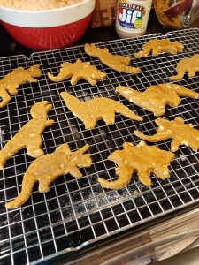 So, I don’t have a rolling pin. But you know what I do have? Ingenuity, that’s what. You can MacGyver the situation by using a wine bottle to roll out that cookie dough. If you don’t have a wine bottle, it’s like I don’t even know you. Same for the dinosaur cookie cutters. You’re on your own here.